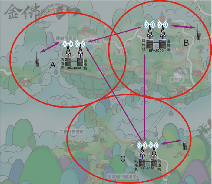 在該通訊方式中,信道機主要負責對個區域手持臺信號的收發工作,在各區域信道機接收的手持臺信號的同時,將通過該基站鏈路機的無線鏈路信號傳輸,將信道機接收到的信號傳輸至其他鏈路基站,由其他鏈路基站的信道機將信號下發至各區域的手持機。在整個景區內實現一會百應的通訊效果。