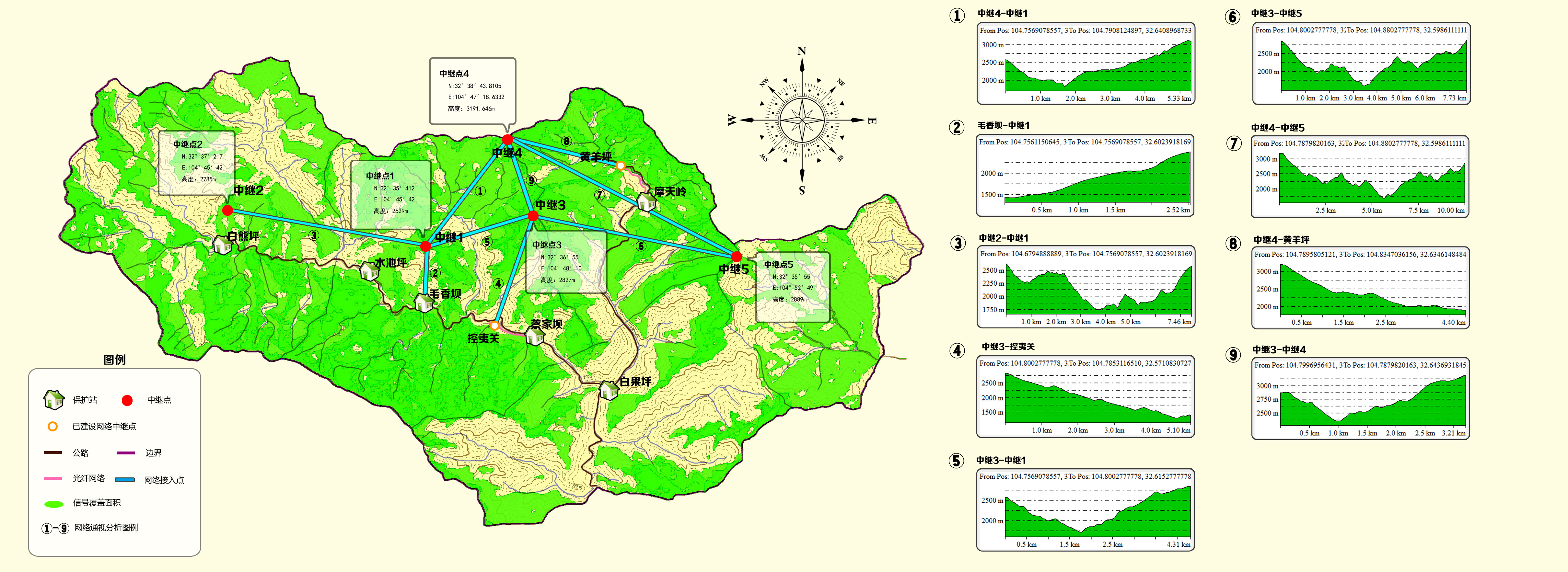 根據圖上等高線的標示,該處區域為盆地,建議中繼架設位置如下圖,采用數字中繼BF-R1000及數字對講機BF-P118或BF-P108配合使用。為保護區的日常管理工作提供通訊保障。