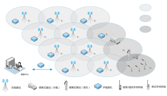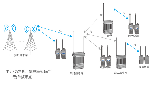 多臺便攜式數字雙頻中繼臺組網形成雙頻自組網網絡,雙頻中繼臺的某一段工作在自組網模式保障各分隊之間的互聯;另一段工作在同頻中繼模式保障本分隊內部通信。