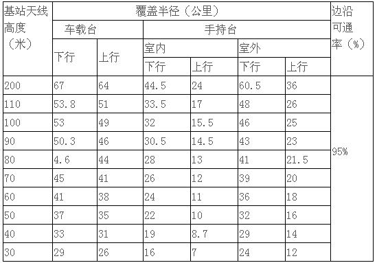 根據(jù)上述計算方法,在不同天線高度的情況下,估算出系統(tǒng)工作的上下行距離: