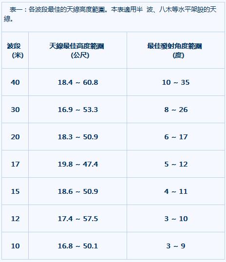 據我所知,大多數天線的架設高度,都在 10~15 公尺之間。這個高度雖然只是 20 米波段的最低要求 (1/2 λ高 ),但僅及表一所列,最佳高度范圍低端的 54%。