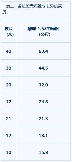 為要解答這問題,逝世不久的名業余家,羅生 (JIM LAWSON, W2PV),曾作了很多天線高度的試驗,并在他的「八木天線設計」一,書中,作出一項結論,認為天線高度在 1.5 倍波長 (λ)時,能面面俱到,是最實用的高度。附表二即例示各波段在 1.5 λ的高度。