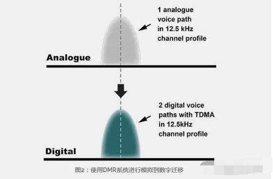 每個通信路徑在12.5 kHz帶寬內有效一半,每個通信路徑使用半x 12.5 kHz或6.25 kHz的等效帶寬。這被稱為每頻譜具有一個通話路徑的效率。然而,對于DMR,整個通道保持與模擬信號相同的輪廓。這意味著DMR無線電在現有12.5 kHz或25 kHz信道的許可證持有者中運行; 因此,沒有必要重新綁定或重新許可,但在渠道容量上加倍。這在下面的圖2中說明。