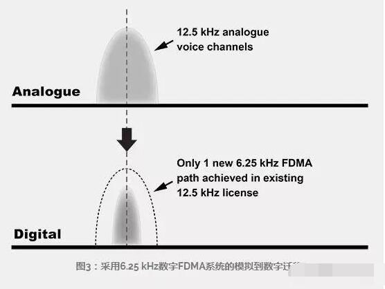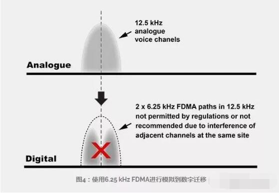 許可證持有者可能需要保留現有許可證,以確保與其自己的傳統無線電或外部組織的模擬系統向后兼容。由于DMR使用12.5 kHz信道,因此內置了所需的頻譜兼容性。如下圖5所示。