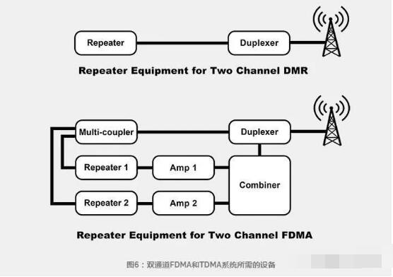 使用DMR TDMA,您可以通過一個中繼器,一個天線和一個簡單的雙工器獲得兩個通信通道。與FDMA解決方案相比,雙時隙TDMA允許您實現6.25 kHz的效率,同時最大限度地減少對中繼器和組合設備的投資。用于簡單系統的兩種方法的所需設備如下面的圖6所示。