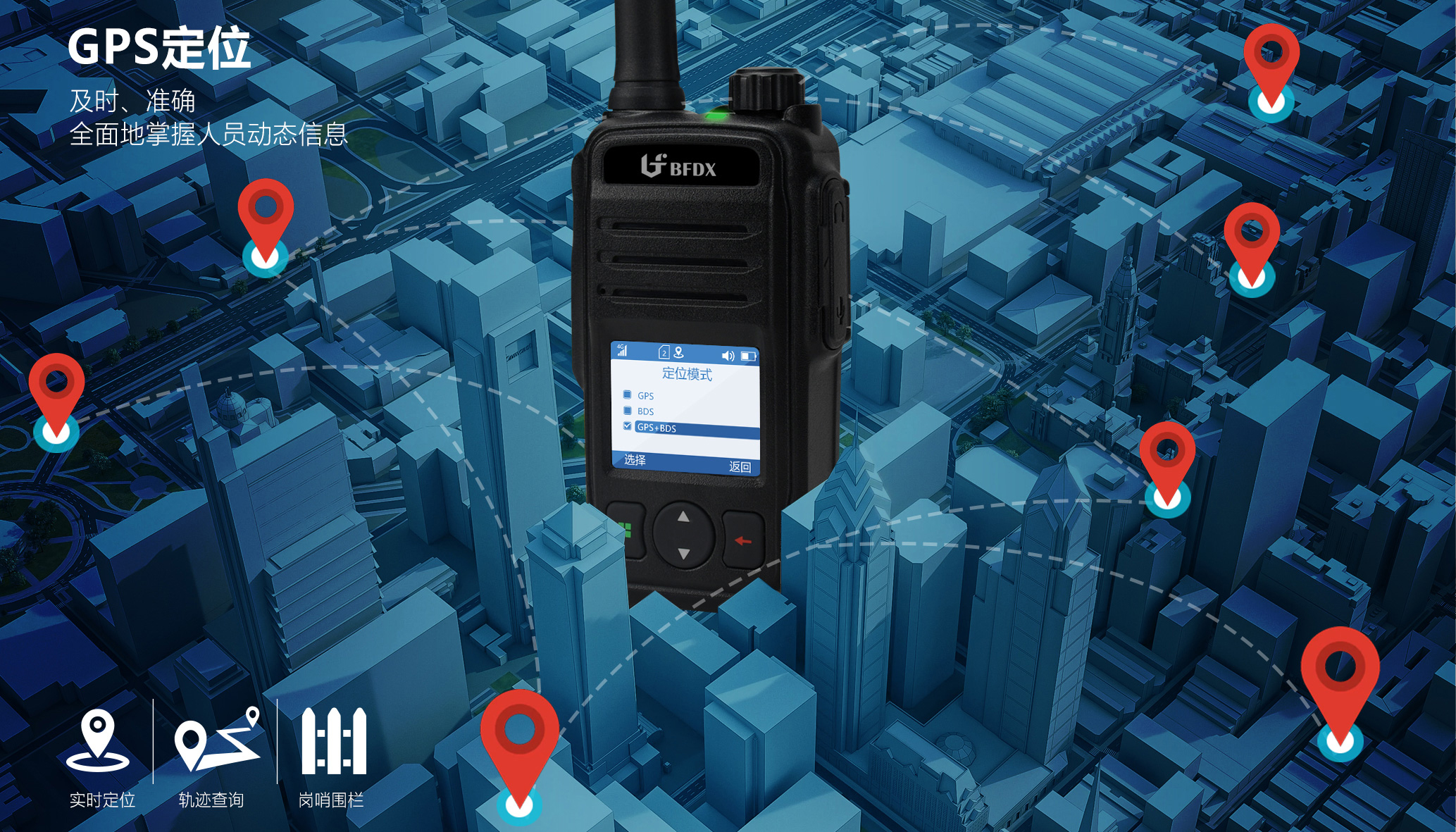 BF-CM630支持選配高精準(zhǔn)GPS定位功能,用戶可通過公網(wǎng)調(diào)度后臺實時獲取人員/車輛及終端位置信息,隨時查看動態(tài)軌跡,掌握團(tuán)隊成員實時現(xiàn)場活動,方便管理層展開調(diào)度與管理全面提升工作中團(tuán)隊協(xié)作效率。戶外單獨作業(yè)或外出旅行時,利用BF-CM630實時發(fā)送GPS信息告知救援人員,為用戶爭取救援時間。